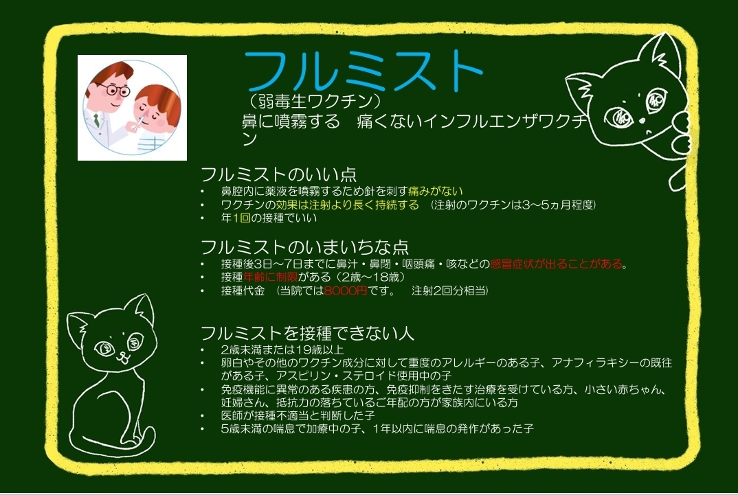 フルミストは鼻に各鼻に0.1mlづつ噴霧する、インフルエンザ弱毒生ワクチンです。注射でないので痛くないです。